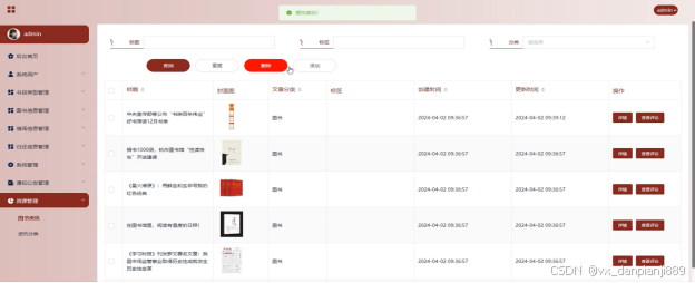 - 资源管理:管理员可以查看图书资讯列表中某个资讯的详情和评论信息,可以对图书资讯、资讯分类信息进行增删改查操作。