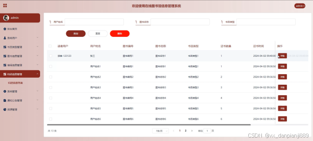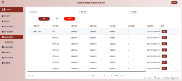 - 借阅信息:管理员可以查看借阅信息列表中某用户的借阅详情并进行审核和回复,可以对借借阅信息进行增删改查操作。