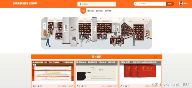 - 首页:首页界面是用户访问系统的入口页面,用户可以查看首页展示的轮播图,图书资讯、图书信息等信息。