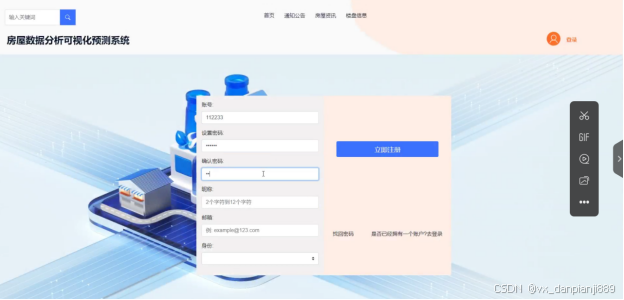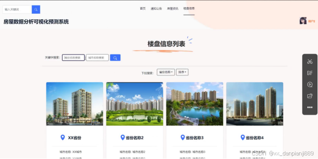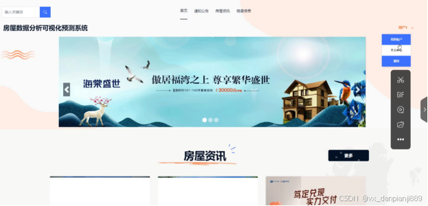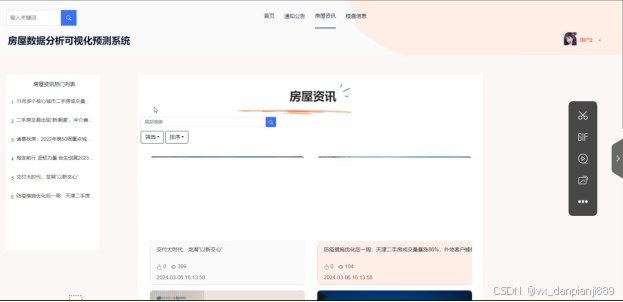 (2)查看房屋数据可视化预测系统的首页信息:房屋数据可视化预测系统的首页信息包含了首页、通知公告、房屋资讯、楼盘信息等。
