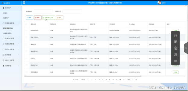 (6)房屋数据管理:管理员点击“房屋数据管理”会显示出所有的房屋数据信息,支持输入楼盘名称或者销售状态对房屋数据信息进行查询,如果想要添加新的房屋数据信息,点击“导入”按钮,上传对应文档,点击“导入”按钮就可以添加了,同时可以选择某一条房屋数据信息,点击“删除”进行删除。