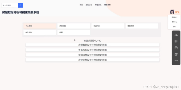 (7)个人中心:在“个人中心”这一菜单下,我们会看到首页、房屋数据、各省均价、房价走势、楼盘信息、收藏,用户可以对其进行操作。
