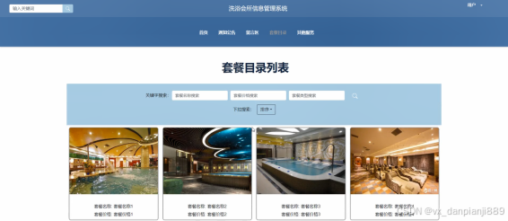 套餐目录:用户点击可通过搜索套餐名称、套餐价格和套餐类型进行查看套餐目列表;同时可对套餐服务进行点赞、收藏、评论和预约操作。界面图如下。