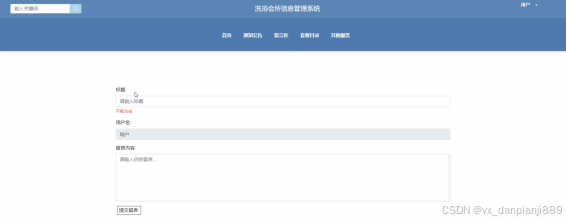 This project aims to develop a set of information management system of bath club based on Spring Boot, aiming to improve the efficiency of information management and customer service quality of bath club. By integrating the powerful back-end support of Spring Boot framework and flexible front-end interaction design, the system will realize user management, appointment management, service viewing and other functions, and provide an integrated and efficient information management solution for the bath club. The design of the system aims to improve the management level of the bath club, improve customer satisfaction, and promote the healthy development of the bath club business.