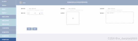 其他服务管理:管理员点击可查看其他服务列表和其他服务添加;点击“其他服务添加”,输入服务名称、服务类型、技师名称、服务价格,上传技师照片和输入服务简介,点击“提交”按钮进行添加。界面图如下。