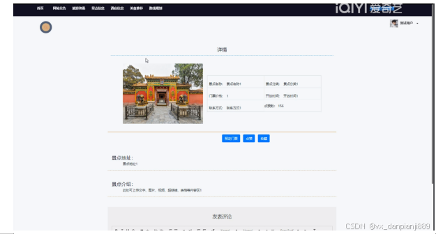 (5)景点信息:用户可以查看景点信息,在查询到自己想要了解的景点信息的时候,可以进入查看详细的介绍,在景点信息详情这个界面,同时支持用户对喜欢的景点信息进行预定门票、收藏、点赞、评论的功能。