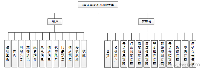 乡村旅游管理总体分为前台用户模块和后台管理员模块。