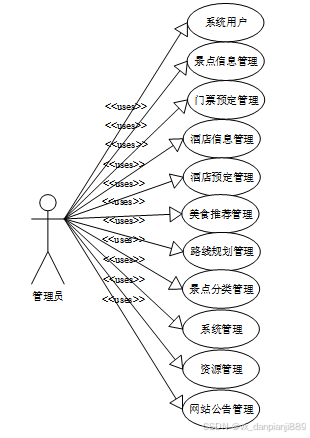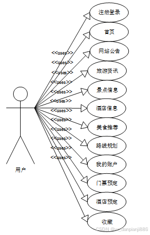 在后台,系统管理员扮演着不同的角色,分为管理员和普通用户。管理员主要负责对整个系统的管理和维护。他们可以管理用户信息,包括添加、删除和修改用户账户信息。管理员还可以管理景点信息管理、门票预定管理、酒店信息管理、酒店预定管理、美食推荐管理、路线规划管理、景点分类管理等相关信息,以保证系统数据的准确性和完整性。此外,管理员还可以对用户的评价和评论进行审核和管理,确保内容的真实性和合法性。同时,管理员还可以对景点信息进行管理和维护,包括添加新的景点信息,更新现有景点的相关内容,用户用例图如下所示。