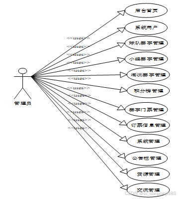 系统设计的目的是分析系统包括的所有功能结构,为开发人员设计开发和实现系统做好准备工作。经过前期的需求调查、分析和整理之后,确定的总体需求主要包括多个模块,分别是:后后台首页、系统用户、球队赛事管理、小组赛事管理、淘汰赛事管理、积分榜管理、赛事门票管理、订票信息管理、系统管理(轮播图)、公告栏管理、资源管理(新闻列表、新闻分类)、交流管理(足球论坛、论坛分类)。系统整体角色分为两个部分,一是普通用户、二是管理员,权限分布也是很明显,管理员可以实现对用户的增加以及删除,是最高权限拥有者。