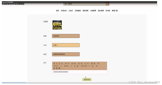 足球论坛:输入封面图、标题、分类、标签、正文等信息,点提交,可以发表论坛。足球论坛界面图如下图所示。