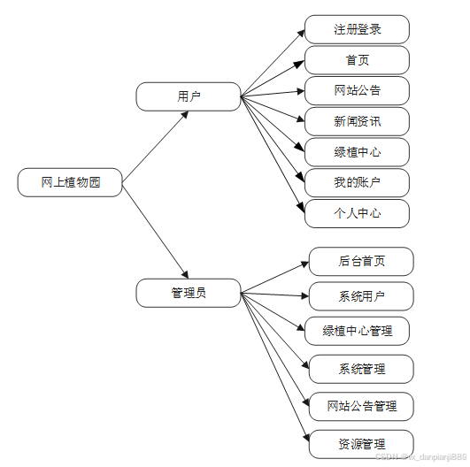 (3)确定好系统使用的技术,进行在线确认系统所划分的用户角色,并且根据用户角色划分确定所要设计的功能模块,对网上植物园的设计主要划分别为管理员和用户角色,并所使用的功能模块也相应不同,但是系统的数据库实现的内容是交互的,用户可以随时根据自己的需求进行论坛交流,对于系统工作人员可以根据自己的分管内容进行在线信息的处理及操作,管理员获取到所有用户的详细数据信息,并根据需求进行第一时间处理解决。
