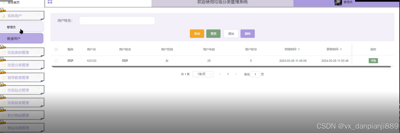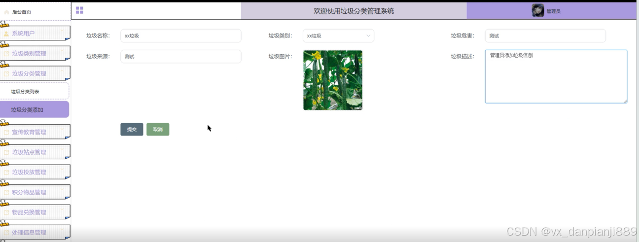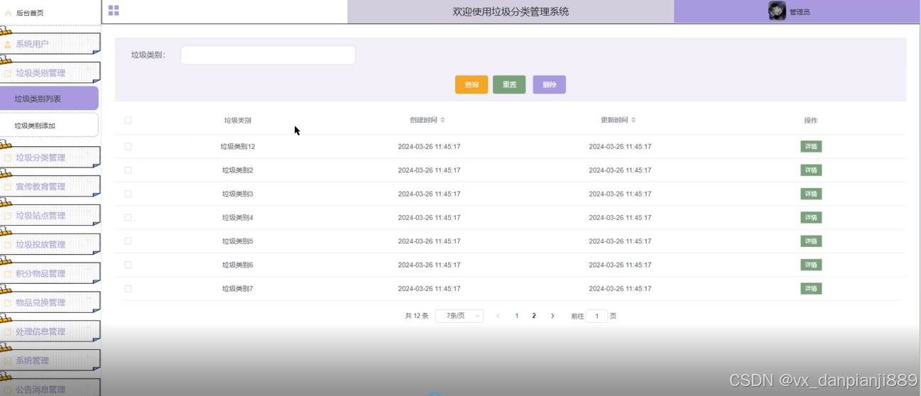 - 垃圾类别管理:管理员可以管理垃圾的分类信息,包括查看、添加、修改、删除垃圾类别。