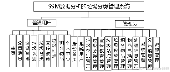 垃圾分类管理系统的功能分析包括管理员和员工用户两个角色。管理员可以通过主页了解分类状况,管理用户权限,记录分类管理库信息,对垃圾进行分类管理,发布通知公告,并管理个人信息。具体功能分析如下: