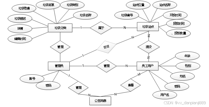 下面是整个垃圾分类管理系统中主要的数据库表以及总E-R实体关系图。
