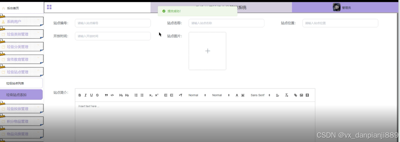 - 垃圾站点管理:管理员可以管理垃圾站点的信息,包括查看、添加、修改、删除垃圾站点。