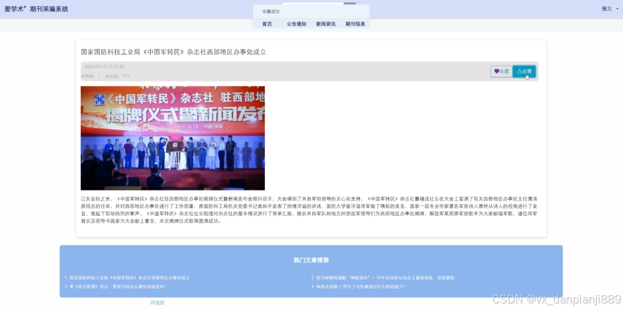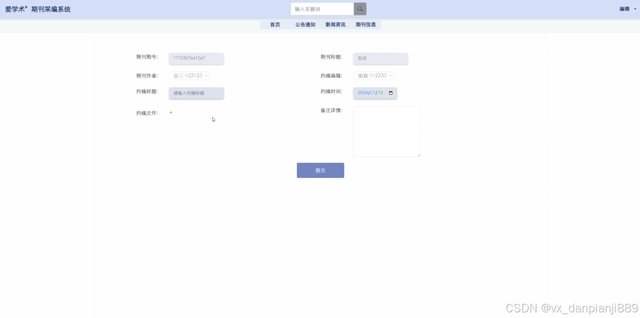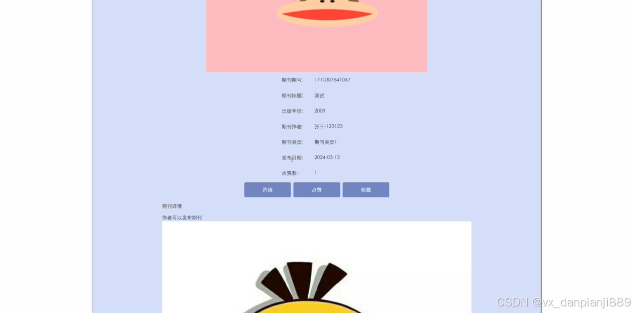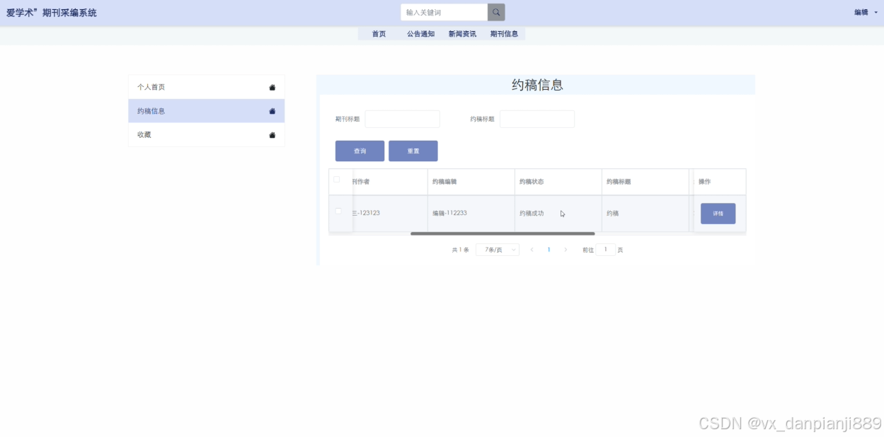 (5)期刊信息:前台用户可以查看期刊信息,在查询到自己想要了解的期刊信息的时候,可以进入查看详细的介绍,包括期刊期号、期刊标题、出版年份、期刊作者、期刊类型、发布日期、期刊详情等信息。用户在个人中心后台发布期刊信息,待管理员审核后可展示在此模块。在期刊信息详情这个界面,支持作者用户和编辑用户对喜欢的期刊信息进行点赞、收藏以及评论的功能,同时还支持编辑用户进行约稿操作。