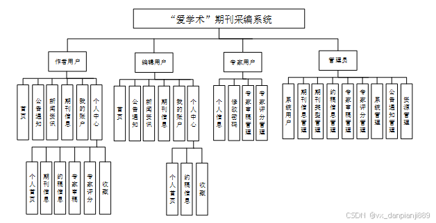 (3)确定好系统使用的技术,进行确认系统所划分的用户触,并且根据用户触划分确定所要设计的功能模块,对“爱学术”期刊采编系统的设计主要划分别为管理员、作者用户、编辑用户和专家用户,并且所使用的功能模块也相应不同,但系统的数据库实现的内容是交互的,用户可以随时根据自己的需求进行在线期刊信息搜索,对于系统工作人员可以根据自己的分管内容进行在线信息的处理及操作,管理员获取到所有用户的详细数据信息,并根据需求进行第一时间处理解决。