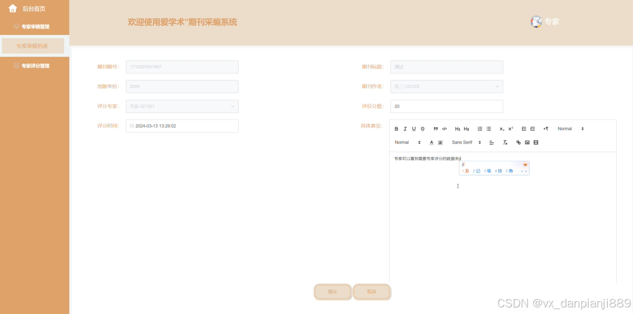 专家用户登录系统后台,主要功能是对作者用户提交的需要专家遴选的期刊信息进行评分,可以对专家审稿管理、专家评分管理等模块的信息进行管理。专家用户后台管理界面如下图5-11所示。