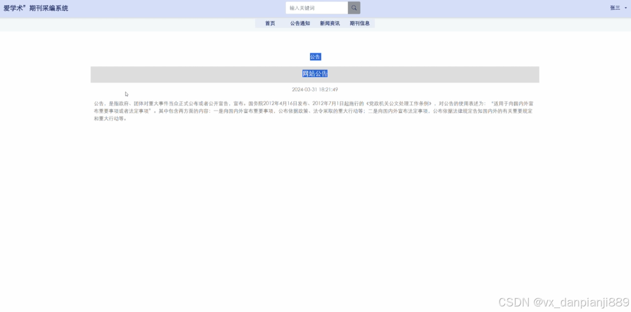 This design mainly implements a "Love Academic" journal editorial system that combines the advantages of humanization, high efficiency, and convenience. It realizes functional modules such as system users, journal information management, journal type management, invitation information management, expert review management, expert rating management, system management, public notice management, and resource management. The system communicates with the server through a browser to achieve data exchange and change. You only need to use a computer and move your fingers to operate the system, achieving data communication management. The entire system design process fully considers issues such as data security, stability, and reliability, and the operation process is simple. This system improves work efficiency and reduces errors and omissions in data storage through scientific management and convenient services.
