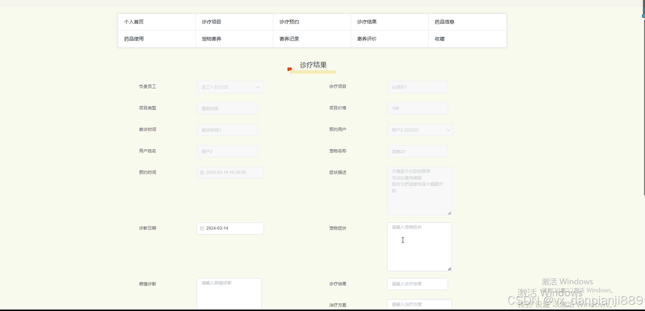 - 点击“诊疗预约”可查看预约详情,同时可填写诊疗结果,包括诊断日期、宠物症状、病情诊断、诊疗结果、诊疗方案、护理建议,上传相关资料。