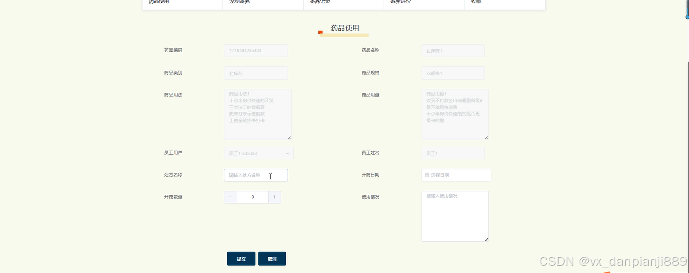 - 点击“药品信息”可进行填写药品使用操作,包括处方名称、开药日期、开药数量和使用情况。界面图如下。