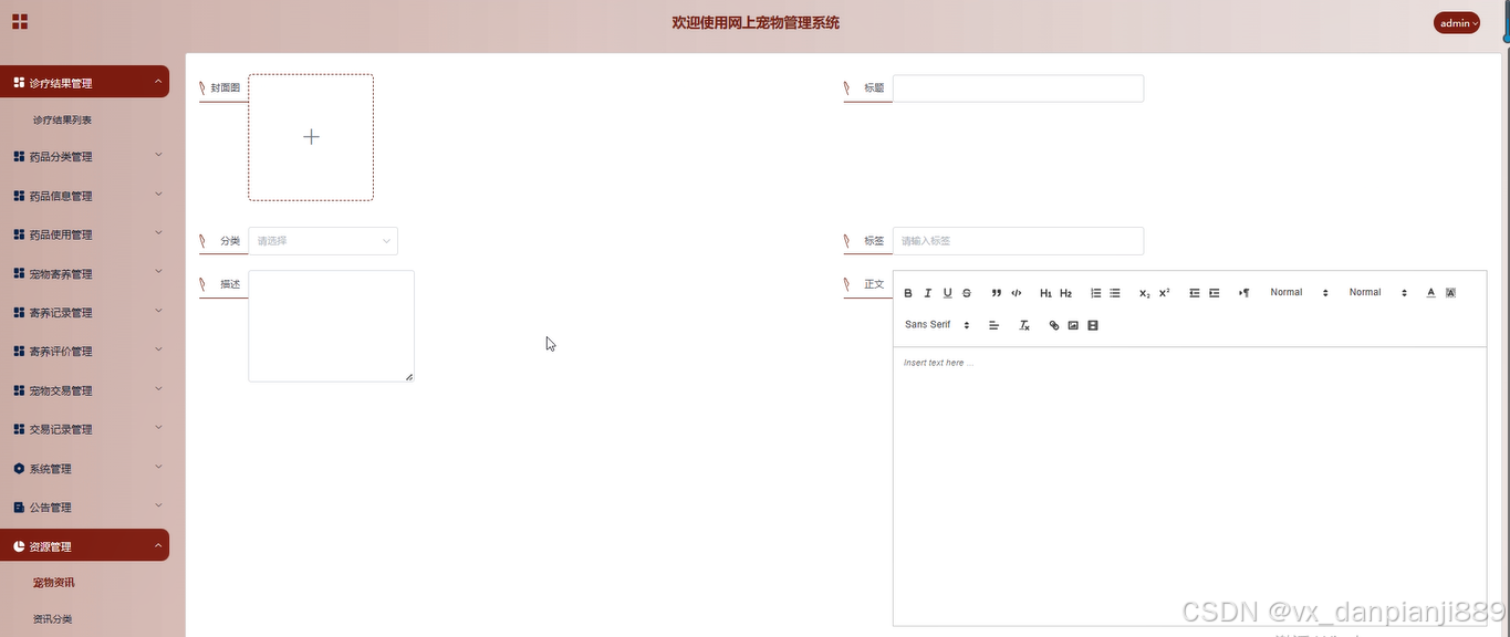 资源管理:管理员点击可查看宠物咨讯和咨讯分类;如需添加新的宠物资讯,点击“新增”按钮,上传封面图,输入标题,选择分类,输入标签、描述和正文,点击“确认”按钮进行添加。同时可对咨讯进行增删改查。如下图所示。