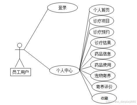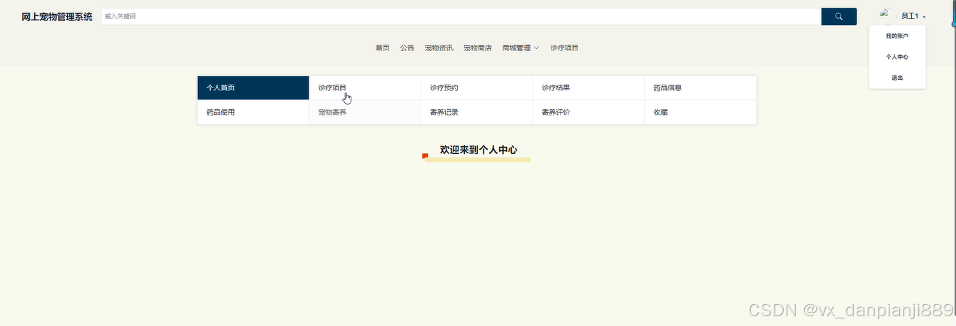 个人中心:员工点击头像可查看“个人中心”,包括个人首页、诊疗项目、诊疗预约、诊疗结果、药品信息、药品使用、宠物寄养、寄养评价和收藏。如下图所示。