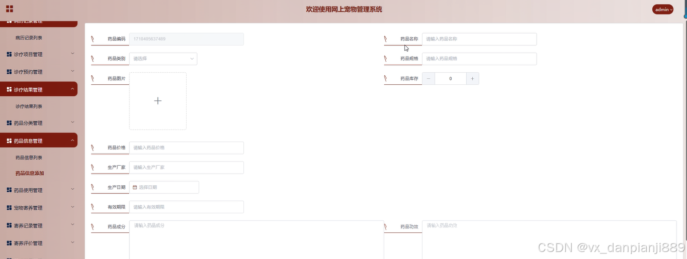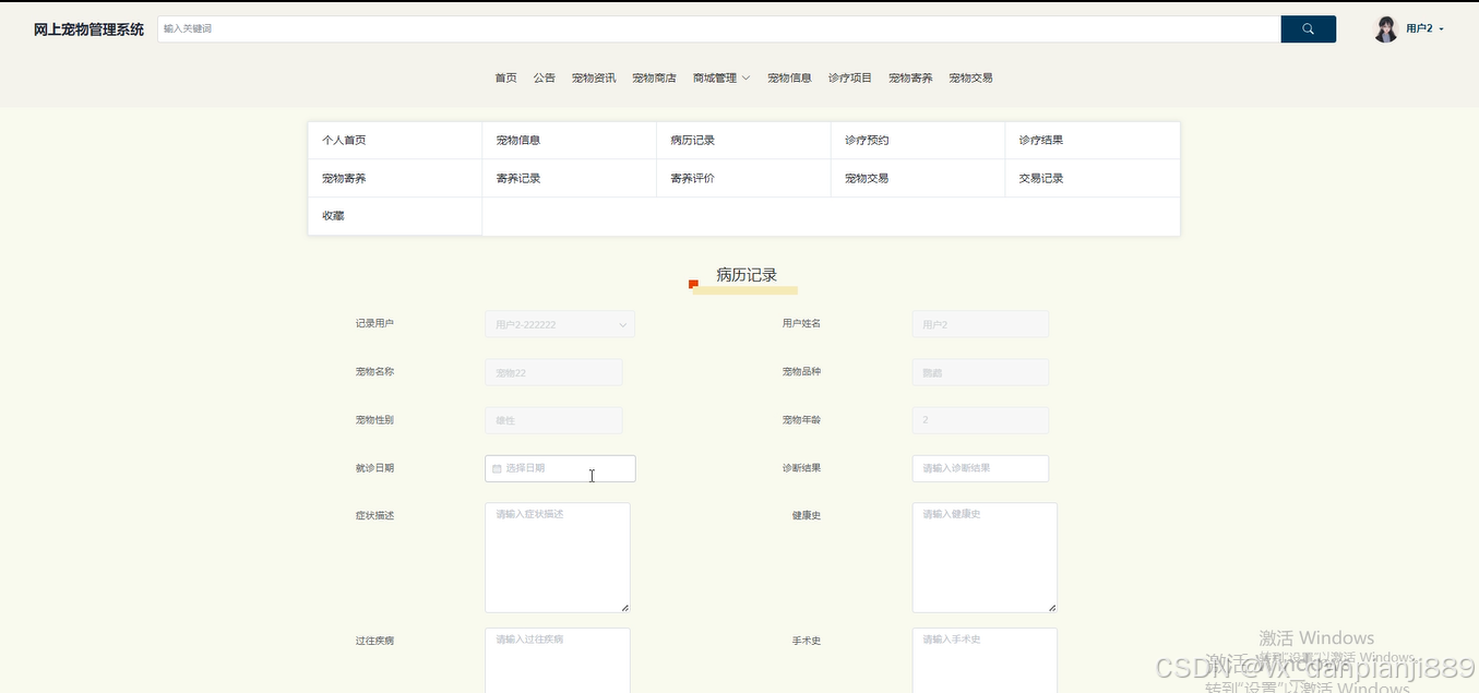 First of all, this paper analyzes the system requirements and clarifies the functions and characteristics of the system. Then, the architecture design of the system is introduced in detail, including front-end interface design, back-end database design and data interaction flow. Then, it introduces the design and implementation process of the system's main modules, including pet information management module, case record management module, diagnosis and treatment project management, drug information management, pet foster management, pet trading management, mall management, etc.