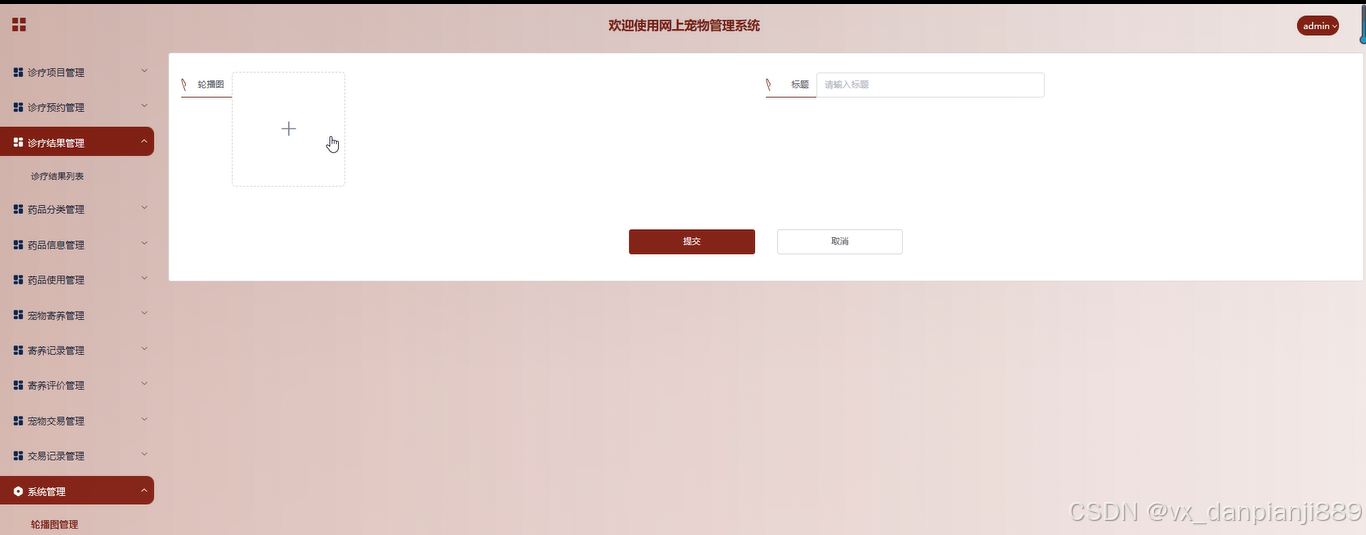 系统管理:当管理员点击“系统管理”时,可查看轮播图; 如需添加新的轮播图,点击右侧“添加”按钮,上传图片,输入标题,点击“确认”按钮进行添加;同时可对轮播图进行增删改查。如下图所示。