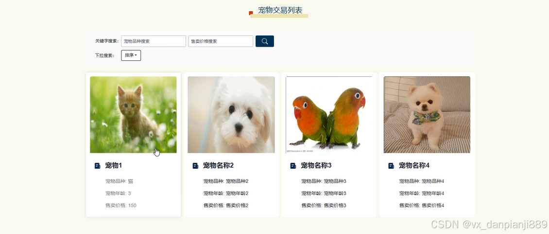 宠物交易:用户点击可通过搜索宠物品种和售卖价格进行查看宠物交易列表,同时可对交易详情进行点赞、收藏、评论和交易操作。