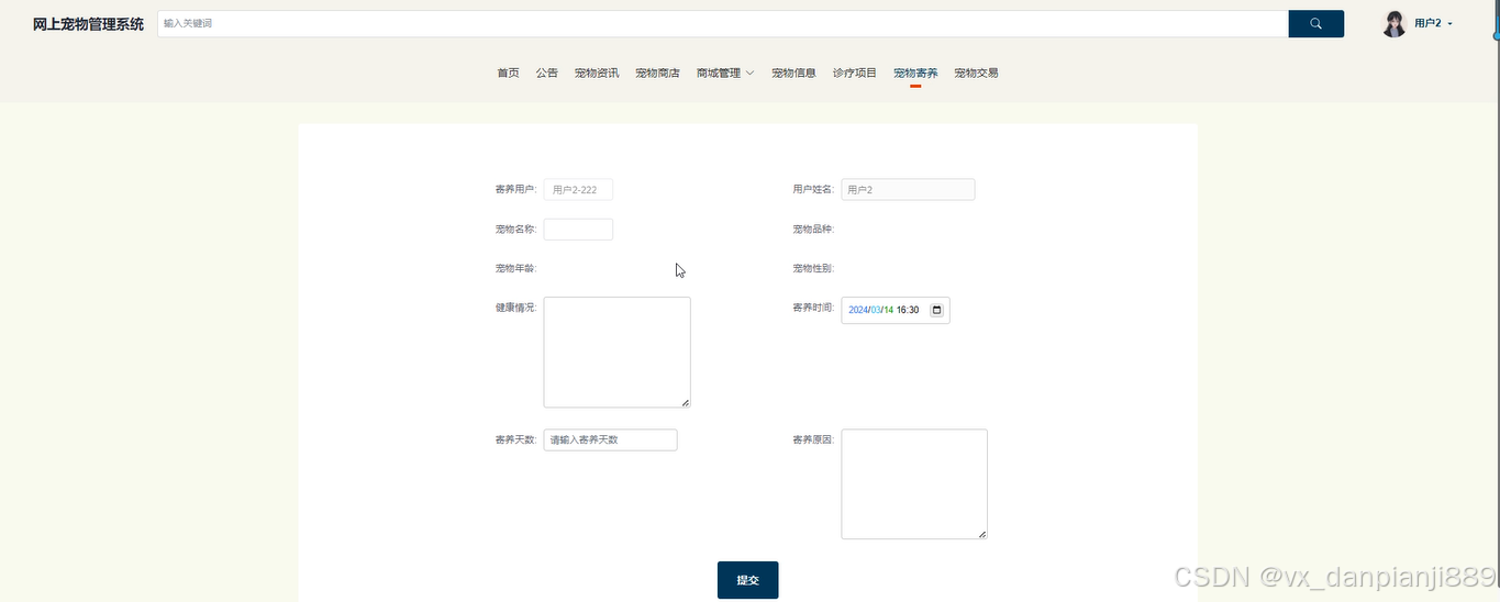 宠物寄养:用户点击可填写宠物寄养信息,包括宠物名称、宠物品种、宠物年龄、宠物性别、健康情况、寄养天数和寄养原因。界面图如下。