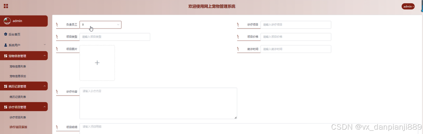诊疗项目管理:管理员点击可查看诊疗项目列表和诊疗项目添加;点击“诊疗项目添加”,选择负责员工,输入诊疗项目、项目类型、项目价格,上传项目图片,输入诊疗内容和项目明细,点击“提交”按钮进行添加。如下图所示。