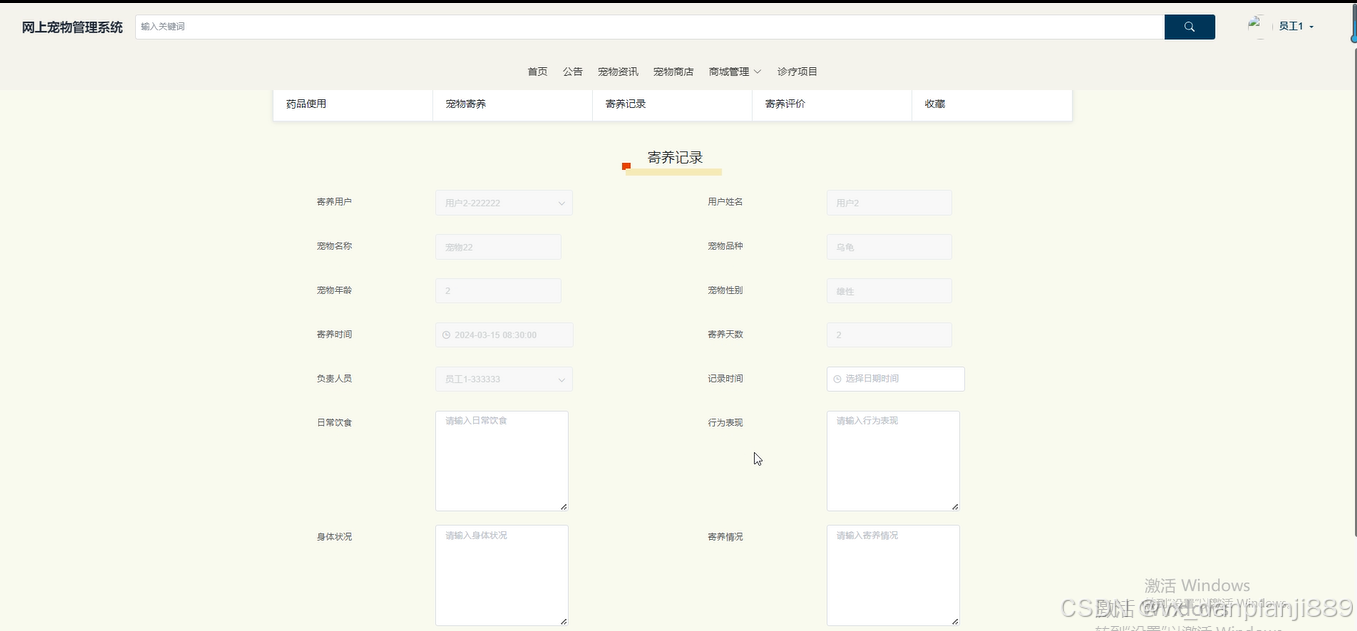 (3)点击“宠物寄养”可填写宠物日志,包括记录时间、日常饮食、行为表现、身体状况和寄养情况。界面图如下。