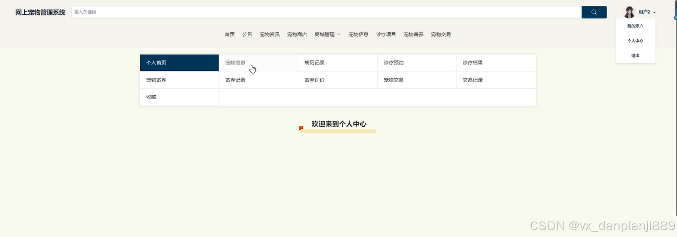 个人中心:用户点击头像可查看“个人中心”,包括个人首页、宠物信息、病例信息、病例记录、诊疗预约、宠物寄养、寄养记录、寄养评价、宠物交易和收藏。界面图如下。