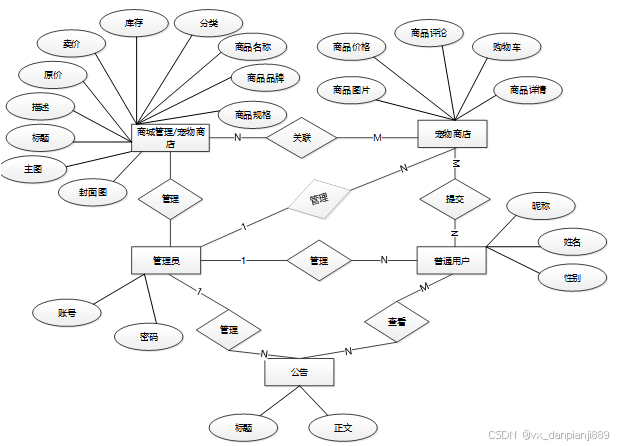 概念设计主要是通过数据库的概念结构和模式进行建立数据库嗯逻辑结构,然后利用数据库的DBMS进行完成,它不需要计算机系统的支持。通过系统的整体来看,主要是对数据库进行管理、整理、更新等操作。数据库的功能是非常强大的,每个系统的开发肯定离不开数据库,通过数据库可以看得出整个系统的质量和效率,根据以上的系统分析,对系统中的主要实体进行规划。以下是网上宠物管理系统总体E-R关系图实体图。