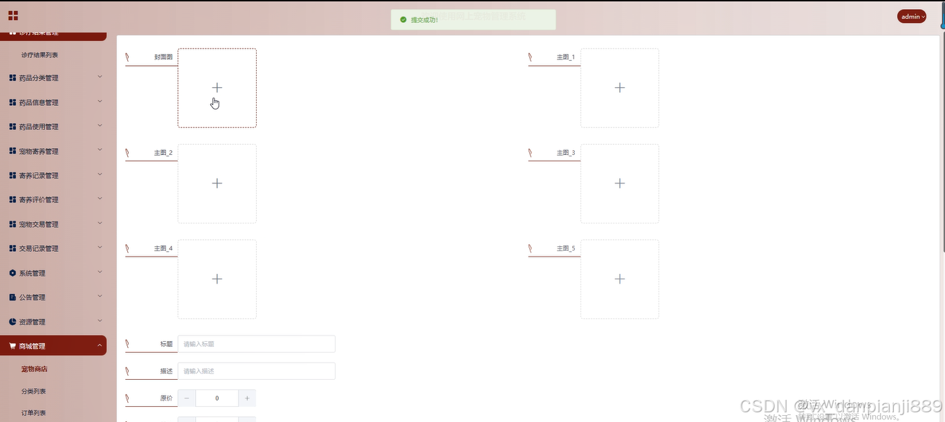 商城管理:管理员点击可查看宠物商店、分类列表和订单列表。点击“宠物商店”,上传封面图和主图,输入标题、描述、原卖价、库存,选择分类,输入商品名称、商品品牌、商品谷歌和正文,点击“提交”按钮进行添加新的宠物商品。如下图所示。