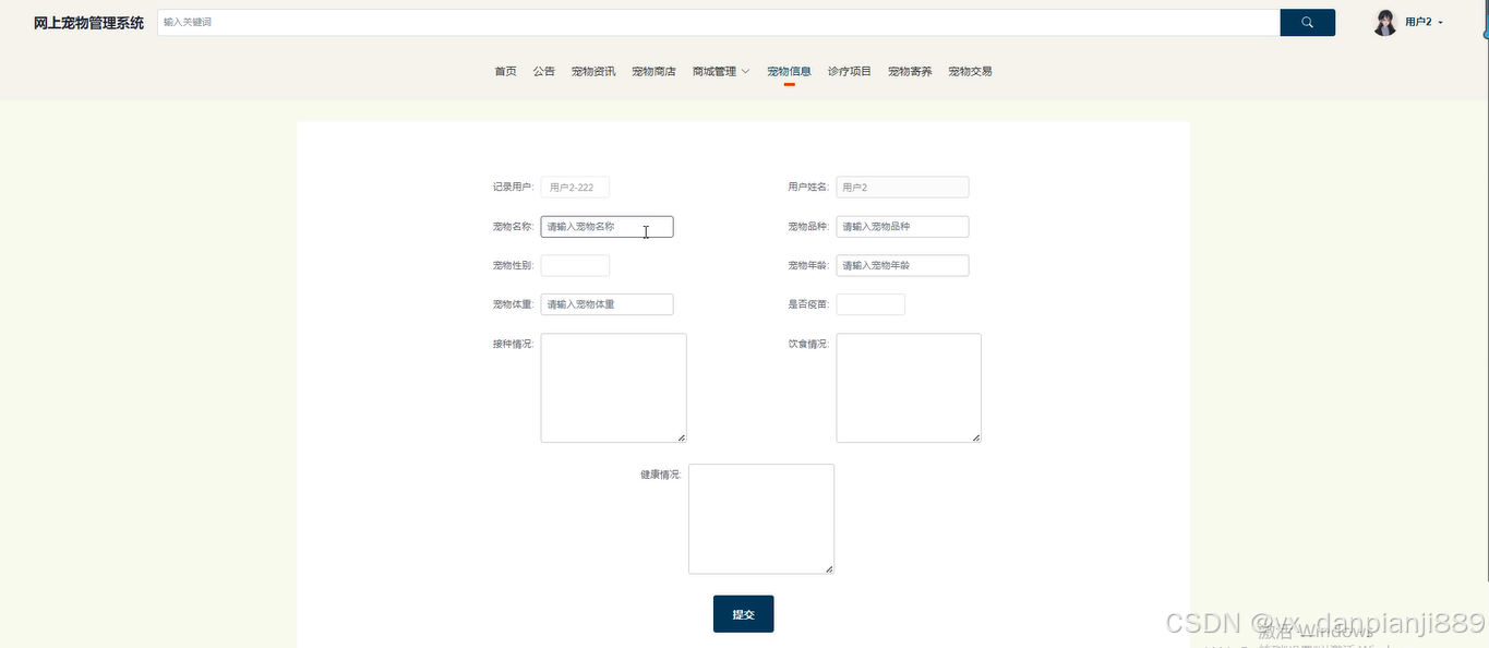 (1)点击“宠物交易添加”,选择宠物名称,输入宠物品种、宠物年龄、宠物性别、健康情况、售卖价格,上传宠物照片,输入宠物描述、宠物介绍、宠物详情,点击“提交”按钮进行添加。
