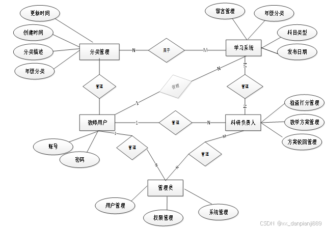 构成教学管理系统的要素很多,但最主要的要素有:教师、科研负责人、管理员。教学管理系统便是以这三个要素为核心构成的。