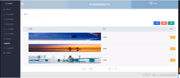 - 系统管理:在系统管理界面,管理员可以查看所有轮播图信息,可以对系统轮播图信息进行查询、添加和删除操作。