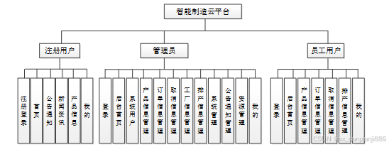整个系统是由多个功能模块组合而成的,要将所有的功能模块都一一列举出来,然后进行逐个的功能设计,使得每一个模块都有相对应的功能设计,然后进行系统整体的设计。智能制造云平台结构图如图3-2所示。