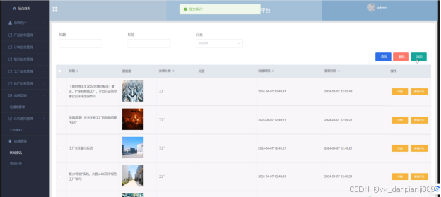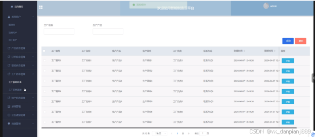 - 工厂信息管理:管理员可以添加工厂信息,可以查看已有的工厂信息列表中某个工厂的信息详情,可以对工厂信息进行查询、重置和删除操作。