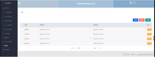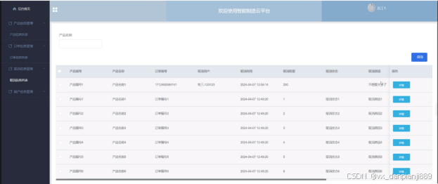 - 产品信息管理:用户可以查看产品信息列表中某个产品的详情,可以查询和删除产品信息。