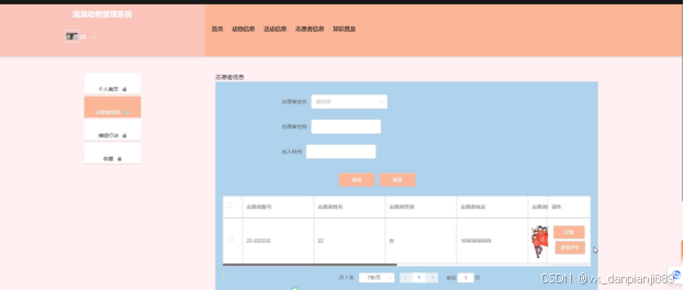 - 志愿者信息管理:管理员可以查看志愿者信息列表中某个志愿者详情和评论;可以对志愿者信息进行增删改查操作。