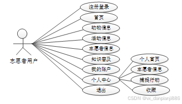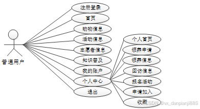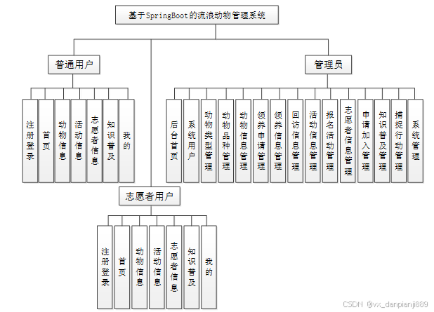 按照 基于SpringBoot的流浪动物管理系统的角色,主要包括普通用户、志愿者用户和管理员这三大功能模块,各模块功能如下。