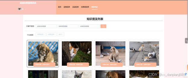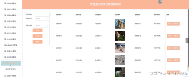 This system is developed using the Spring Boot framework, which is an open-source framework based on the Java language. It has the advantages of simplicity, efficiency, cross platform, and easy maintenance, and is widely used in the development of enterprise level applications. It provides a range of built-in features and tools that can greatly simplify the development process of web applications. This system mainly includes three functional modules: ordinary users, volunteer users, and administrators, achieving core functions such as animal information management, activity information management, volunteer information management, adoption information management, and user management. The study of this system aims to improve the management of stray animals and promote adoption work, improve social attitudes towards stray animals, and contribute to enhancing the survival of stray animals.