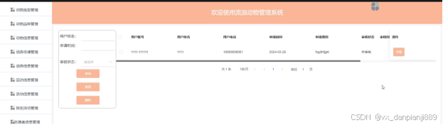 - 领养申请管理:管理员可以查看领养申请列表中某个用户提交的领养申请品的详情并进行审核和回复,审核通过后可以发送领养信息,可以对列表信息进行查询、重置和删除操作。