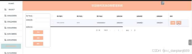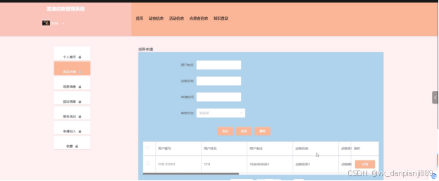 - 领养信息管理:管理员可以查看领养信息列表中某个用户的领养信息详情并提交回访信息,可以对列表信息进行查询、重置和删除操作。