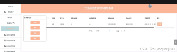 - 系统用户:管理员可以查看系统用户(管理员、普通用户、志愿者用户)列表中某个用户的详情;可以对系统用户信息进行增删改查操作。