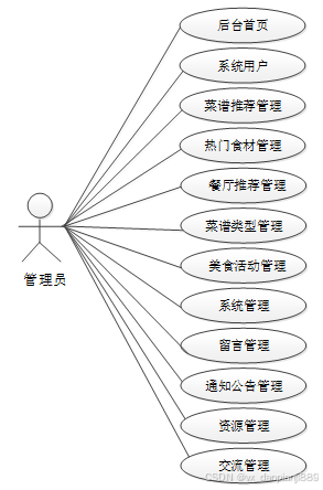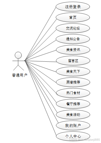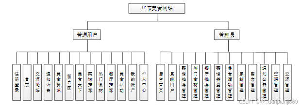 按照毕节美食网站的角色,主要划分为普通用户和管理员这两个模块,各模块功能内容如下。