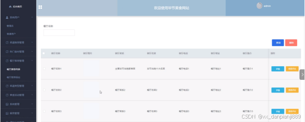 管理员可以添加餐厅推荐信息,可以查看餐厅推荐列表中的某一餐厅的详情和评论信息,可以对餐厅推荐列表信息进行查询和删除操作。其界面如下图4-13所示: